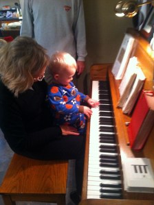 Home church starts off with hymns, usually. With my mom at the piano we gather ’round and sing hymns like “How Firm A Foundation” or “Fairest Lord Jesus” or as in our case last month, Christmas carols. Since we are an unrehearsed “worship team,” my mom occasionally stumbles her way through a song while my dad keeps on singing in his beautiful clear tenor voice. My mom adds in her lovely soprano or perhaps if she knows it, sings the harmony. I never know the harmony, although I sometimes try, so I usually end up singing the melody, voice cracking on the high notes and all. Darrell stands next to me quietly singing the words in his deep voice. He’s off key for almost the entire song, save a few notes here and there. Then there’s my brother, whose recently taken to singing the songs with us. I mean really singing the songs. These days that’s about it. My other two sisters and their husbands are sometimes there, particularly around the holidays. This past home church experience, even Jacob got in on the action.