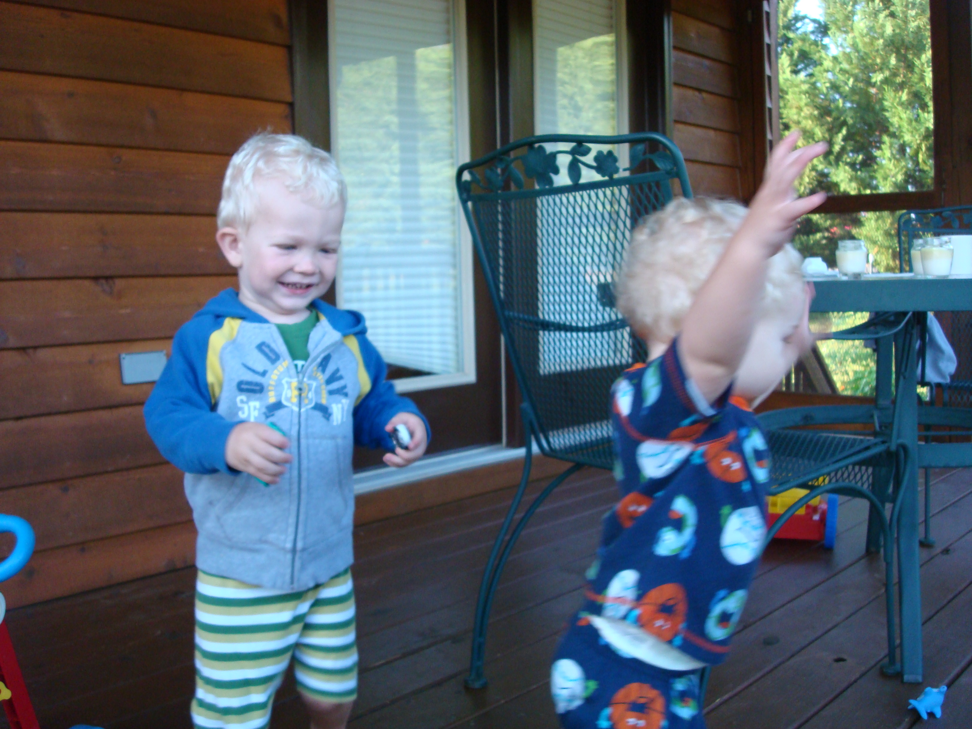 I spend three quarters of my day chasing kids, making PBJs, wiping dirty body parts, picking up cars, puzzle pieces, books, zoo animals…you get the idea. My most used lines lately are: “If you don’t (obey mommy) on the count of three…,” “No hitting,” “No pushing,” “No tackling,” “If he’s crying that means he doesn’t like it,” “Now it’s Landon’s (Jacob’s) turn,” and others.